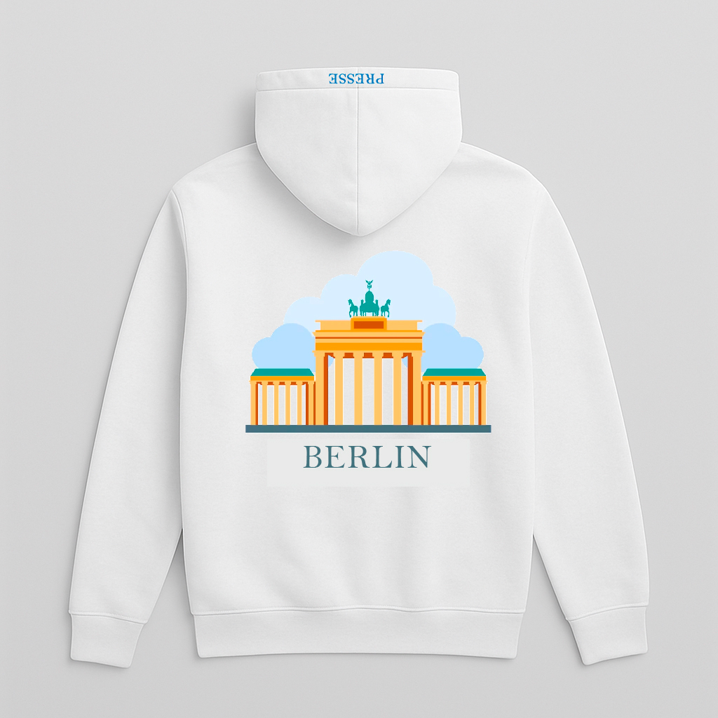 Белое худи высокого качества с уникальным принтом Бранденбургских ворот и фирменным логотипом Berliner Telegraph. Современный и лаконичный дизайн подойдёт для тех, кто ценит эстетику городов и чистую графику.