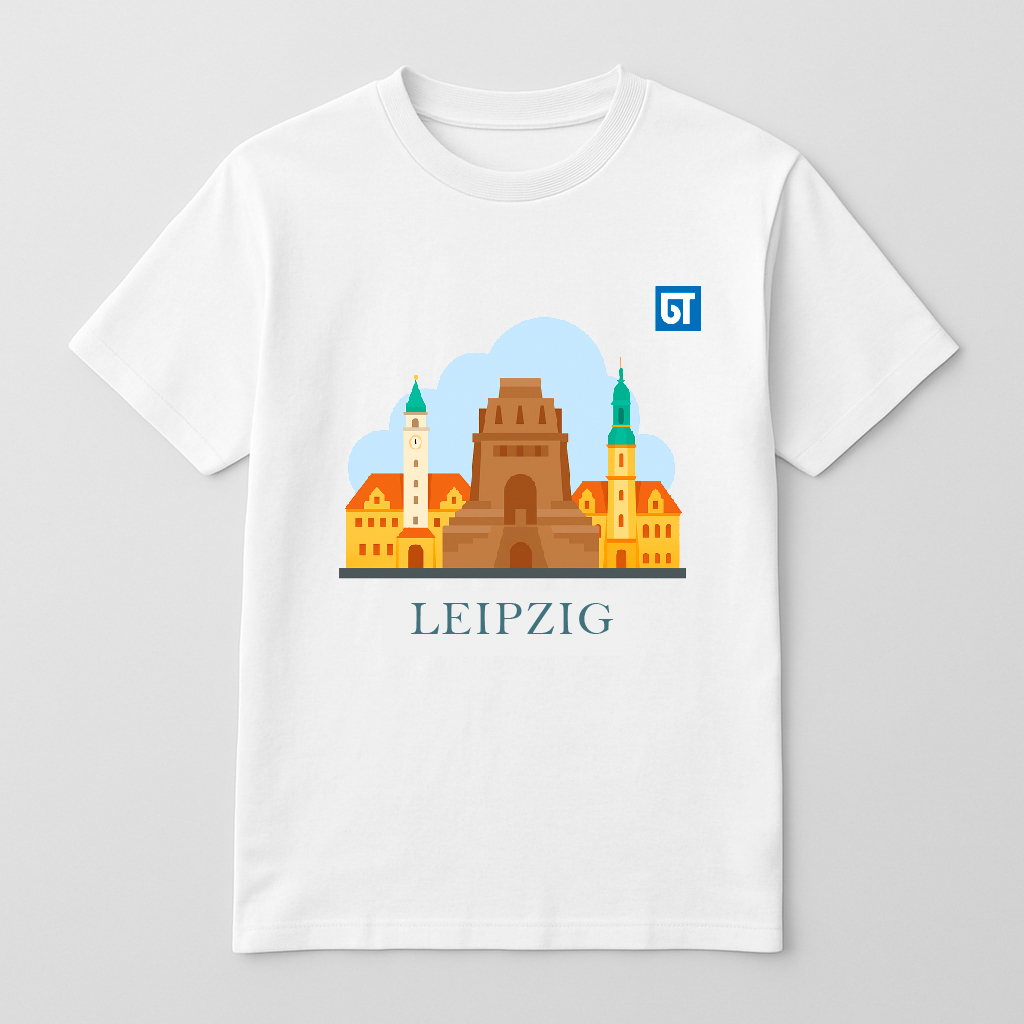 Футболка с мягким мультяшным изображением символов Лейпцига: в центре — величественный Памятник Битве народов (Völkerschlachtdenkmal), по бокам — характерные здания Старого города. Всё выполнено в тёплой цветовой палитре, с логотипом BT как акцентом на причастность к медиа и культуре.